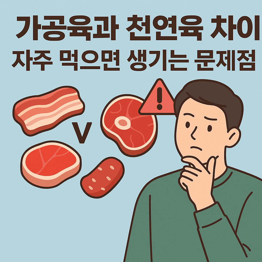 햄, 소시지, 베이컨처럼 가공육은 간편해서 자주 먹게 된다.하지만 천연육과 비교했을 때, 영양 구성과 건강에 미치는 영향은 크게 다르다.장기적으로 보면 가공육 위주의 식습관은염분, 첨가물, 발암물질 노출 위험까지 높아지기 때문에가끔 먹는 수준으로 조절하는 게 좋다.가공육 vs 천연육 차이가공육은 보존성, 맛, 색을 위해 가공 처리된 고기를 말한다.천연육은 별다른 가공 없이 도축 후 손질만 한 상태의 고기다.가공육: 소시지, 햄, 베이컨, 육포, 스팸 등천연육: 생닭, 생돼지고기, 생소고기 등가공육은 일반적으로 염분, 지방, 보존료, 발색제가 추가돼 있다.반면 천연육은 고기 본연의 단백질과 철분이 중심이다.자주 먹으면 생기는 건강 문제가공육을 자주 먹으면 다음과 같은 문제가 발생할 수 있다.나트륨 과다 섭..